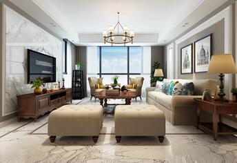 客廳:客廳電視背景墻采用白色護(hù)墻,搭配美式裝飾畫(huà),選用美式家具,將空間層次搭配的條理有序,顯得大方得體.