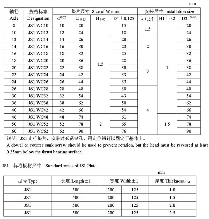JS1 系列止推墊片標準尺寸