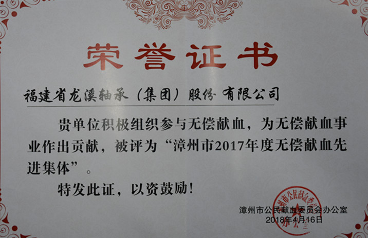 公司榮獲“漳州市2017年度無償獻血先進集體”稱號
