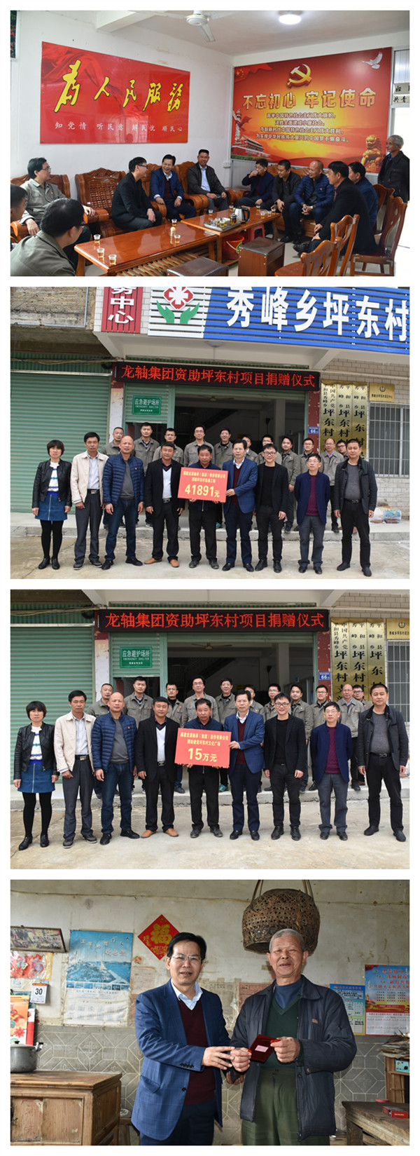 隨后,在村部舉行龍軸集團(tuán)資助坪東村項(xiàng)目捐贈(zèng)儀式,村支書(shū)代表村兩委接受了公司資助坪東村建設(shè)村部文化廣場(chǎng)的15萬(wàn)元和公司全體員工募捐的善款41891元。曾凡沛鄭重要求要善用善款,切實(shí)建設(shè)好村部文化廣場(chǎng),讓村里有個(gè)好的宣傳環(huán)境,讓村民活動(dòng)有個(gè)好去處,豐富農(nóng)村精神文化生活。