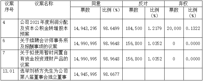 本次股東大會審議的議案十三采用累積投票制,此議案的表決結果僅統(tǒng)計列示表決同意股數(shù)及比例。