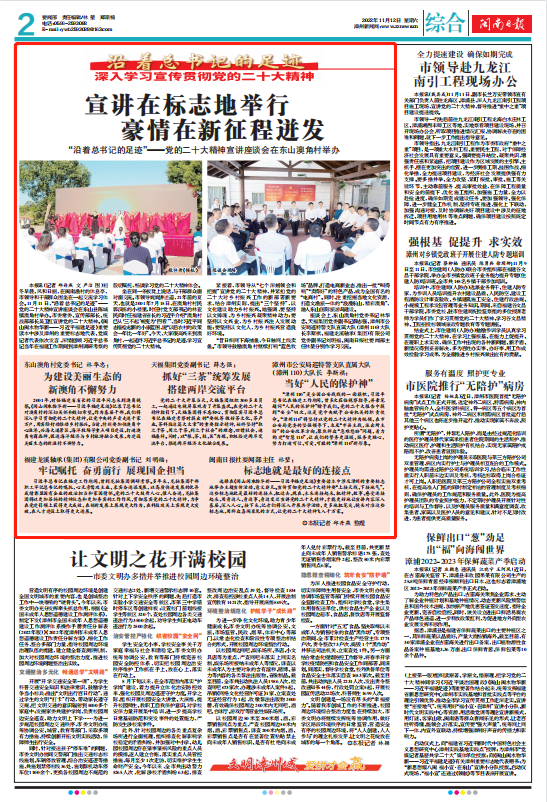 本報訊(記者 邱丹燕 文 嚴潔 圖)初冬早晨,風和日麗,在閩南漁村的休息亭,市領(lǐng)導和干部群眾圍坐在一起交流學習體會。11月11日,“沿著總書記的足跡”——黨的二十大精神宣講座談會在東山縣陳城鎮(zhèn)澳角村舉辦。市委常委、宣傳部部長、統(tǒng)戰(zhàn)部部長吳衛(wèi)紅宣講黨的二十大精神。《閩山閩水物華新——習近平福建足跡》重要讀本中涉及漳州的重要標志地代表、黨媒記者代表依次發(fā)言,深情回顧習近平總書記當年在福建工作期間到漳州調(diào)研考察的殷切囑托,暢談學習黨的二十大精神體會。