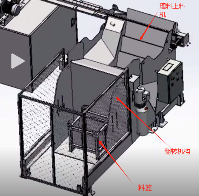 1.1上料:實現(xiàn)整籃上料,翻轉機構將料籃翻轉,物料間歇式倒入理料機(料籃翻轉角度可控),理料機自動理料,有序送料至雙端面磨床進料料道。