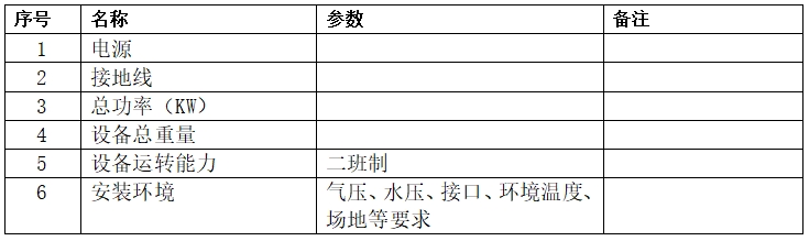 3.設備其他技術指標:(需含設備總功率、電壓、電流、氣壓、水壓、接口、環(huán)境溫度、場地等安裝環(huán)境有關要求)