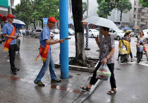 (圖a)志愿者深入到龍軸新村延安北路街頭,為過往行人分發安全生產宣傳資料。