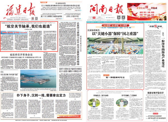 公司以國家安全為己任,自主研發(fā)全球領(lǐng)先的“三大核心技術(shù)”,突破國外技術(shù)和產(chǎn)品封鎖,助力實現(xiàn)我國“大飛機夢”。2023年6月14日《龍軸集團自主研發(fā)出PTFE織物自潤滑襯墊,打破國外技術(shù)壟斷,助力國產(chǎn)大飛機“一飛沖天”——“航空關(guān)節(jié)軸承,我們也能造”》榮登《福建日報》頭版頭條,并獲新華網(wǎng)推介;6月25日《閩南日報》頭版頭條專題報道《龍溪軸承集團:以“關(guān)鍵小器”保障“國之重器”》;獲評漳州市“突出工業(yè)、突破工業(yè)”十件大事。