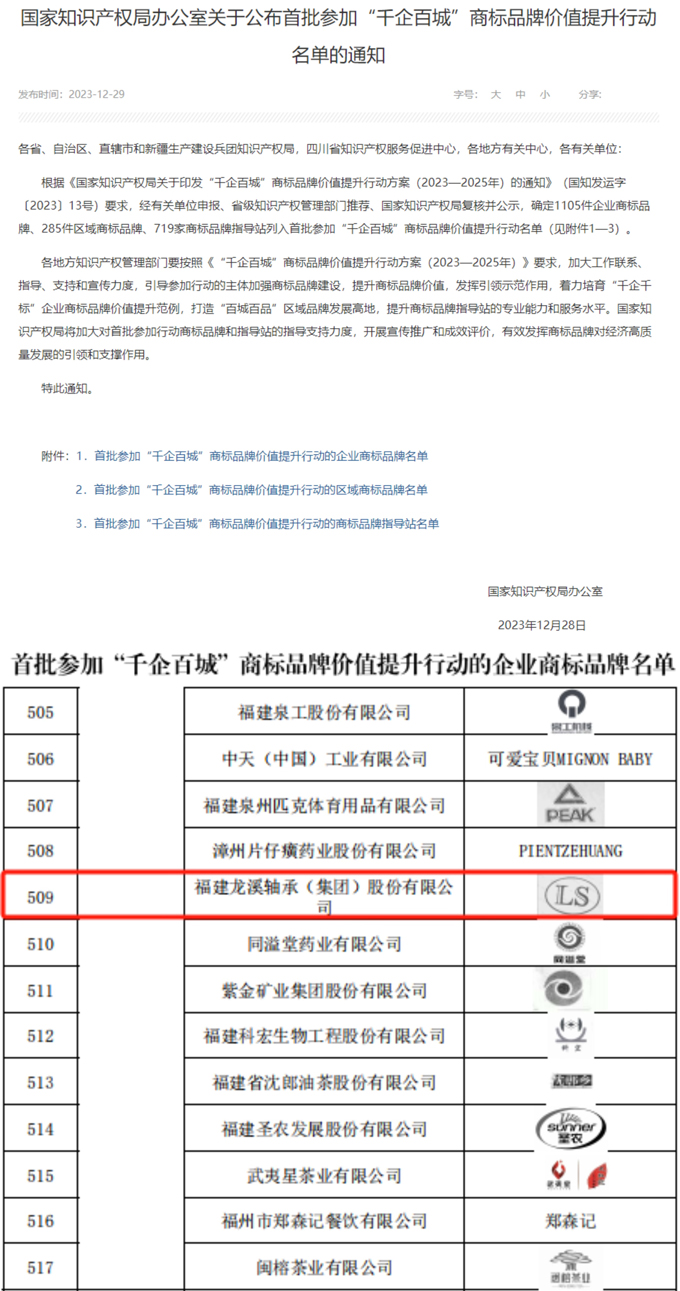 近日,國家知識產(chǎn)權(quán)局公布了首批“千企百城”商標品牌價值提升行動名單,龍軸集團成功入選“企業(yè)商標品牌名單”,成為全國首批1105家(其中:福建省43家,漳州市3家)入選名單之一,集團品牌知名度和美譽度再上新臺階。