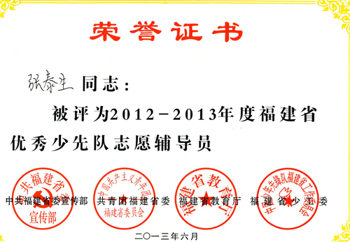 張?zhí)┥?975年7月參加工作,大專學(xué)歷,現(xiàn)任福建龍溪軸承(集團(tuán))股份有限公司黨委副書記兼工會(huì)主席,作為一個(gè)少先隊(duì)志愿輔導(dǎo)員,他熱誠(chéng)服務(wù),積極引導(dǎo)廣大少年兒童勤奮學(xué)習(xí)、快樂(lè)生活、從小樹立遠(yuǎn)大理想,使漳州市通北中心小學(xué)全體少先隊(duì)員的素質(zhì)得到全面發(fā)展,促進(jìn)他們健康快樂(lè)成長(zhǎng),為通北中心小學(xué)少先隊(duì)的工作盡自已一份的微簿之力。近幾年來(lái)先后獲“福建省優(yōu)秀企業(yè)思想政治工作者”、“第三屆全省企業(yè)關(guān)心支持青年工作優(yōu)秀黨政領(lǐng)導(dǎo)”、“熱心支持工會(huì)工作的黨政領(lǐng)導(dǎo)干部”等光榮稱號(hào)。