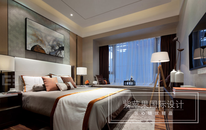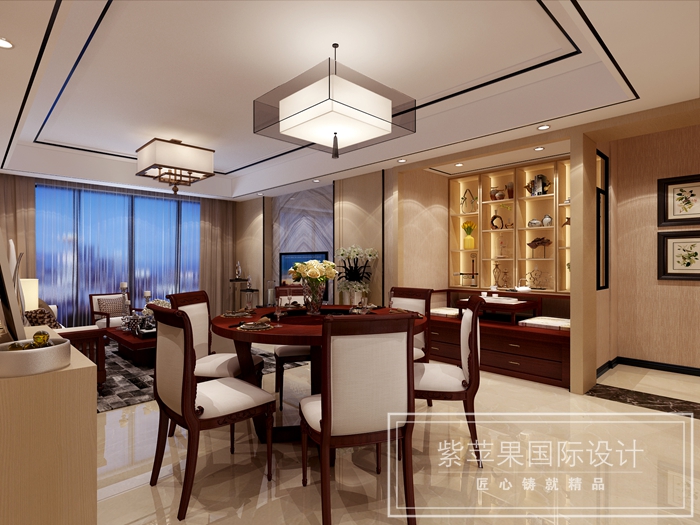 餐廳區(qū)域獨立開辟出一塊羅漢床位置,融合了圍棋對弈、擺件展示、喝茶區(qū)的多功能空間,也使得整個公共區(qū)域更添一抹文化的氛圍和質(zhì)感,臥室里大面積藍色的運用使整個空間更加靜謐安然,有助于忙碌一天的主人更好的入眠,此案活潑大膽的用色體現(xiàn)了設(shè)計師對于色彩的把握,讓我們體驗到了不一樣的新中式。