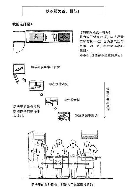 廚房的設施布置應該按照做菜的順序來,從冰箱拿出食材-清洗-處理-烹調(diào),要符合廚房的操作流程,胡亂設置廚房設施的話,累的一定是你……