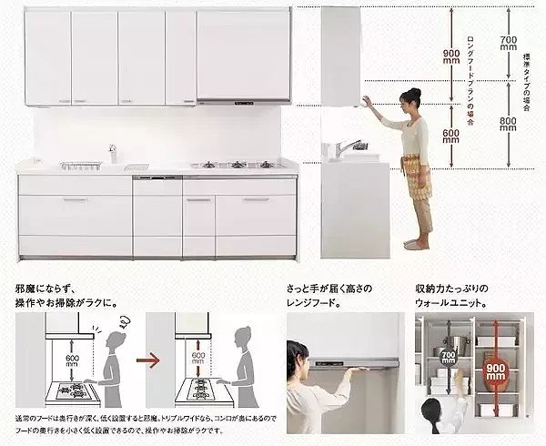 櫥柜由吊柜、臺面、地柜三個部分組成,在設計時一定要考慮好使用者與吊柜的高度、使用者與地柜的高度、吊柜與地柜三個高度。