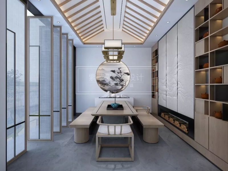 茶室的布置順延墻壁,寬敞的茶桌連接著水墨畫背景的卡座,半墻的壁的展示架等,無論是坐在卡座上品茶還是站起來望著窗外的風(fēng)景微風(fēng)輕輕拂過,如此自然舒暢。