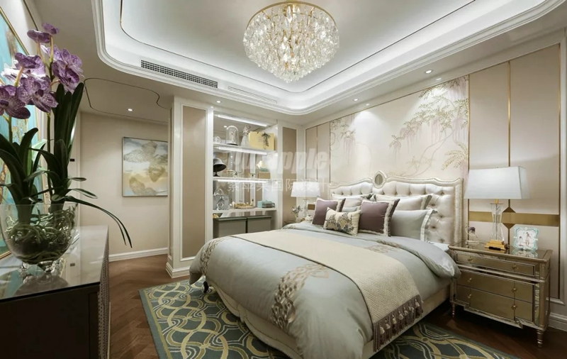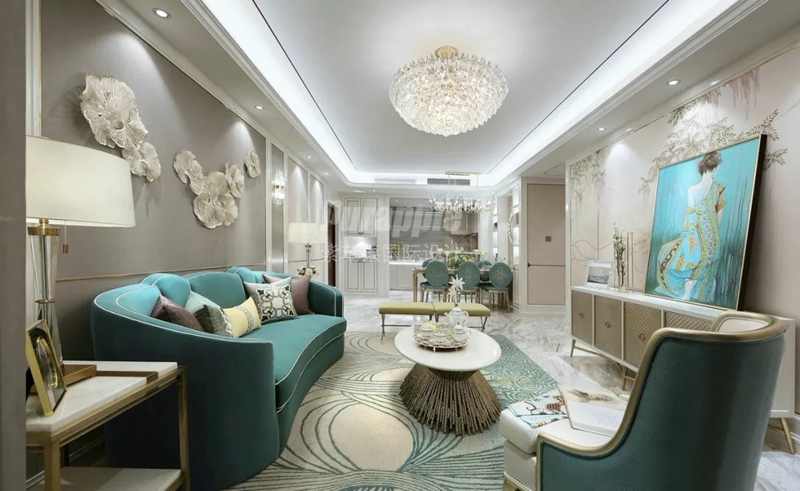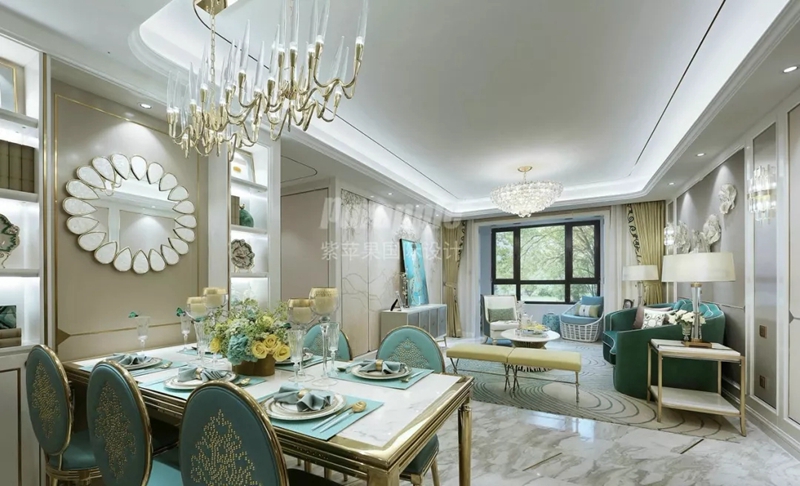 本案戶型方正,動線明朗,因此設(shè)計時在結(jié)構(gòu)上未做過大調(diào)整。空間整體以白色與米色大面積渲染,同時穿插少許奢華的金色點綴空間,整體色調(diào)更加豐富而高級。地板選擇了大理石系,軟裝則以藍色色系修飾空間,通過色系的延伸,保持空間跳色風格的連貫性。