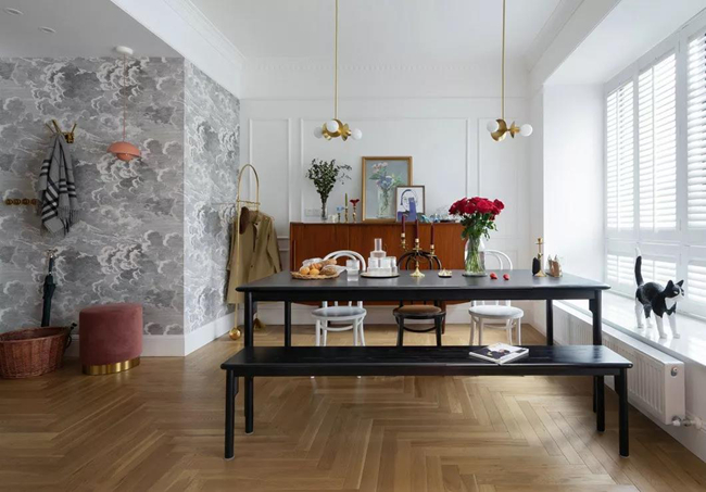 大餐廳放置了2米2的大長(zhǎng)桌,之后的不停歇的家庭聚會(huì),歡聲笑語(yǔ)也都在這里。除了宴會(huì),平常大長(zhǎng)桌也是一家人一起做手工的地方。陽(yáng)臺(tái)的百葉窗,隨時(shí)會(huì)有一束斜陽(yáng)照在俏皮的貓咪身上。
