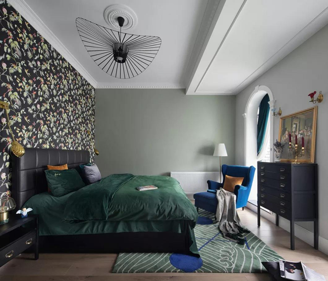 來(lái)自雨林的壁紙,黑色是土壤,綠色是生命,剩下來(lái)的都是生活;坐在床頭,透過(guò)拱門與絨簾,可以感受來(lái)自浴室的春風(fēng)沐雨。