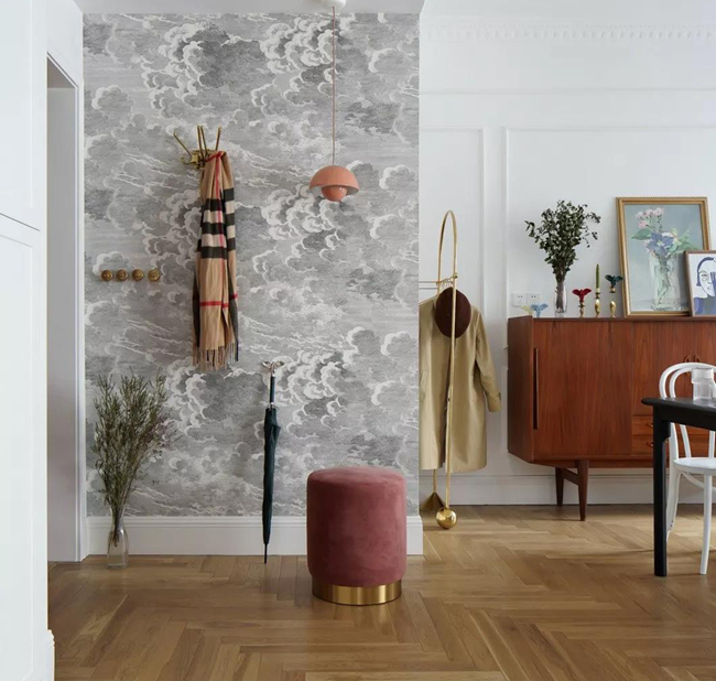 入戶玄關(guān)處中性色壁紙加上暖色調(diào)的換鞋凳和小吊燈,讓整個(gè)空間的溫度有了前奏。