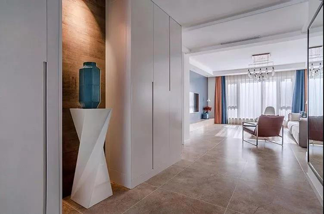 玄關(guān)進(jìn)門(mén)后做了一個(gè)壁龕造型,擺上一只藍(lán)色的花瓶并在頂上裝一盞射燈,整個(gè)空間都顯得格外的溫馨精致。再往里則是通頂?shù)氖占{柜,白色的柜體也讓空間顯得更加的簡(jiǎn)約現(xiàn)代。
