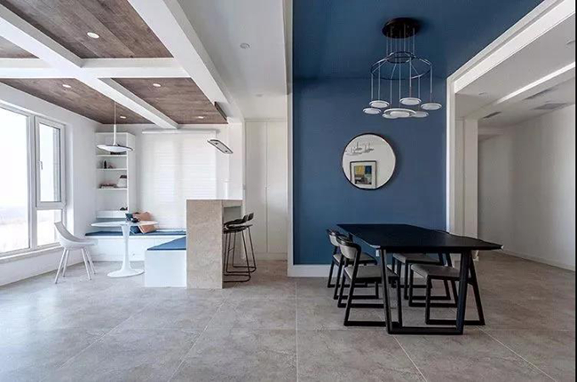 餐廳背景墻也是以雅藍(lán)色為主,中間掛上一個(gè)圓形的鏡子,搭配上禪意端莊的大餐桌椅,還有一套獨(dú)特的盤(pán)狀吊燈,顯得優(yōu)雅而高檔。臨著大面積落地窗邊,讓餐廳空間有著較好的采光,明亮寬敞。