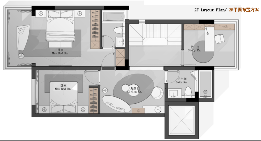 2F: 臥室套房,臥室,起居室,衛(wèi)生間,書(shū)房【88.5㎡】