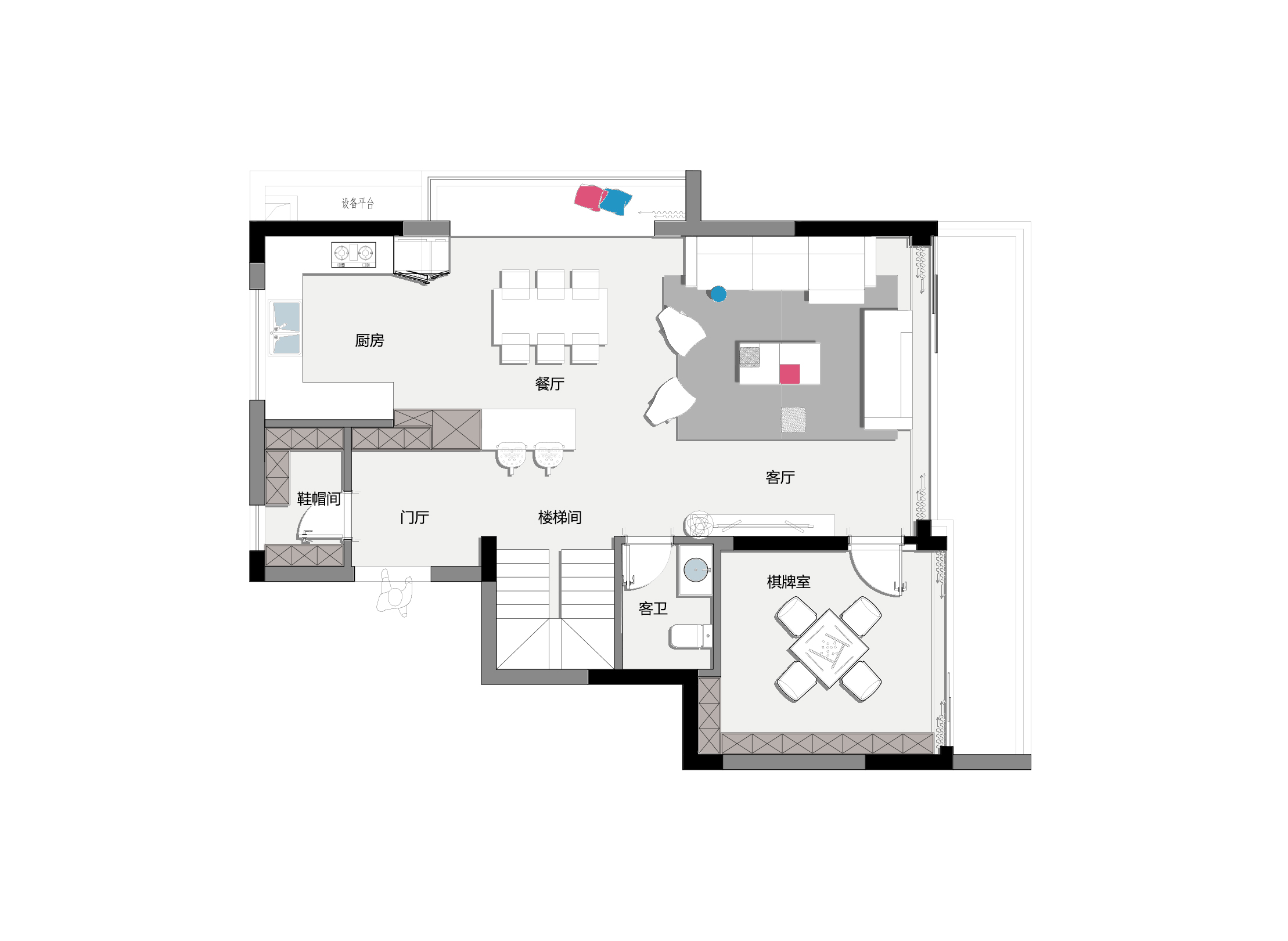 一層方案,一稿是做了一個(gè)半開放式廚房,北面做了一個(gè)次臥可以方便老人居住,沒做老人房的一稿方案把陽臺(tái)打通,是一個(gè)開放式廚房,餐廳連在一起的長島臺(tái),南面是一個(gè)棋牌室或多功能區(qū),品質(zhì)很高。