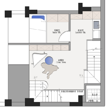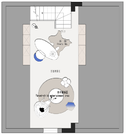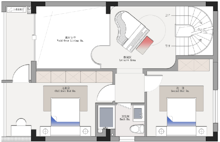 二樓設(shè)置了兩個房間,其中一個兒童房,在樓梯口上來的公共區(qū)域放置了小孩的三角鋼琴,上樓儀式感十足,旁邊一個挑空區(qū)域很浪漫優(yōu)雅,專為女主人打造。