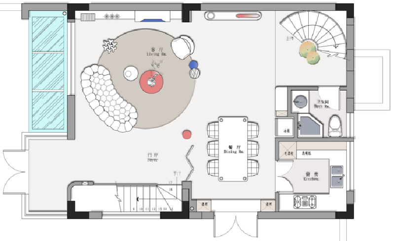 一樓女主人要保留挑高區(qū)域,不打算現(xiàn)澆,一樓設(shè)置了一個法式旋轉(zhuǎn)樓梯,