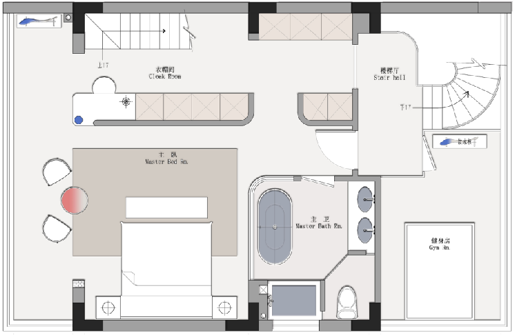 三樓整體做的一個主臥大套房,外面公共區(qū)是一個男主人的健身區(qū)域,后面的樓梯上去閣樓設(shè)置了一個親子娛樂區(qū),整體品質(zhì)非常高!