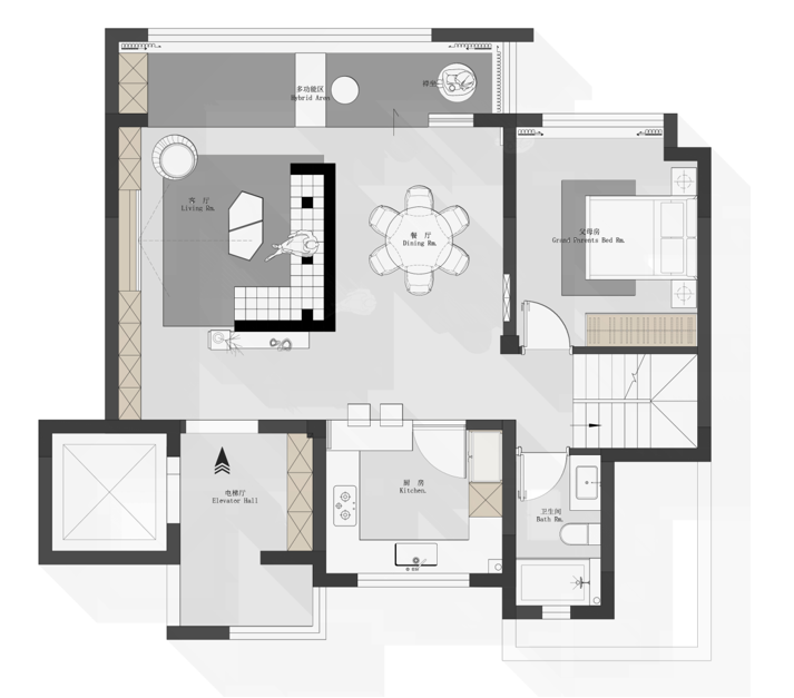 此戶型原始結構比較方正,這個客戶的一樓沒有大動,保留了原始,陽臺打通做了休閑晾曬區(qū)域,u型中廚設計,空間足夠大,可以進行美食烹飪,老人房也設計在了一樓