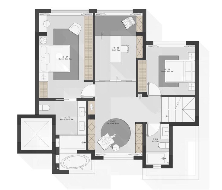二樓我們設計了兩個臥室,東南面是一個主人的大套房,雙臺盆衛(wèi)浴都齊全,還有設計一個大浴缸,外面的區(qū)域大多做了休閑娛樂,應主人的要求安排了書房,南面另一個次臥可以做客房或者兒童房。