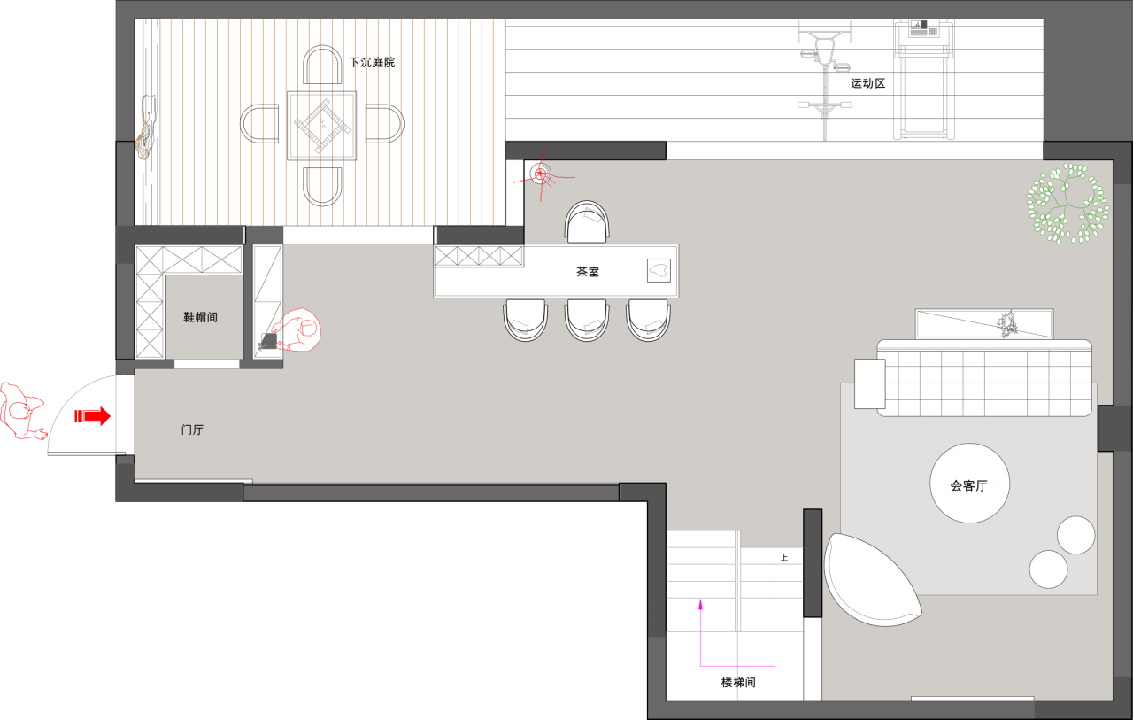 1?地下室負(fù)二層,我們做的是一個下沉式庭院,解決了地下采光的問題,下面功能主要是會客休閑,健身區(qū)域,入戶做了一個獨(dú)立的鞋帽間。