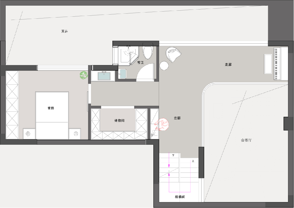2?負(fù)一樓夾層保留了挑空區(qū)域,一部分用于儲藏空間,其他是客臥客衛(wèi)。