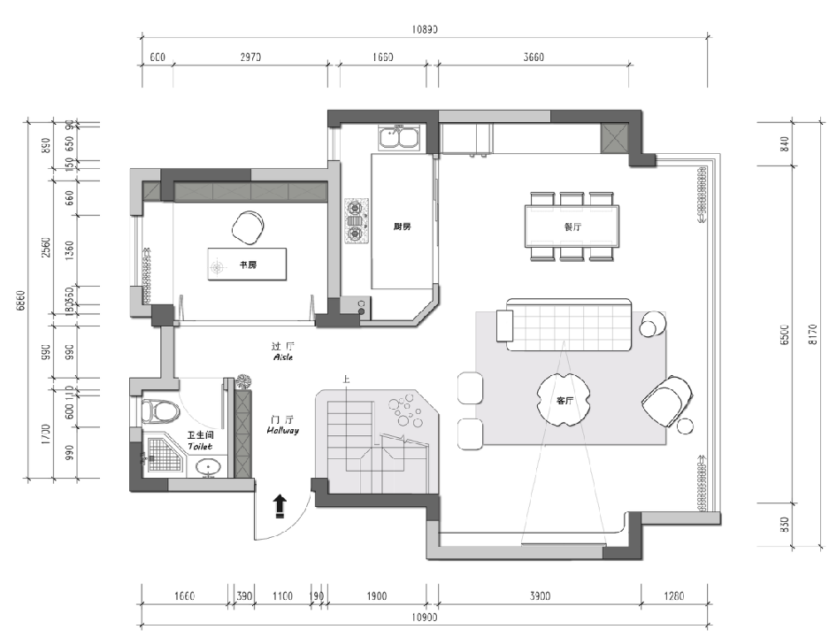 別墅裝修①一層的原始空問(wèn)過(guò)于零碎,設(shè)計(jì)師將衛(wèi)生間外拓,讓北邊空間整齊方正,樓梯太過(guò)狹窄,重新規(guī)劃了尺寸,行走更加舒服,陽(yáng)臺(tái)打通,連在一起的客餐,客廳對(duì)面做了一個(gè)開(kāi)放式書(shū)房。