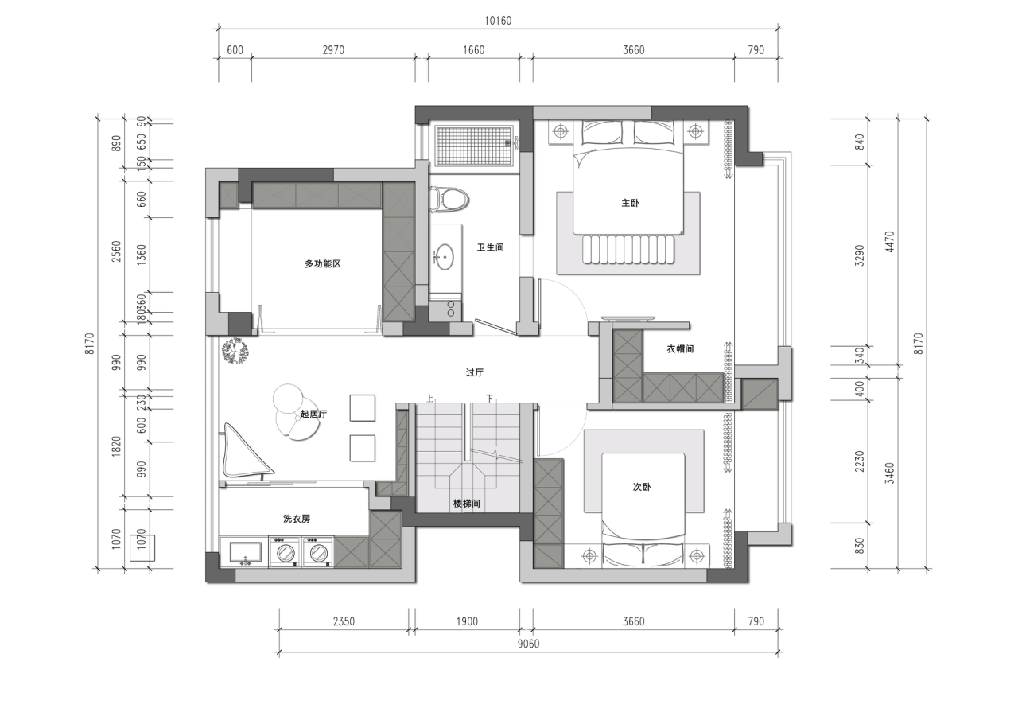 個(gè)次臥,外面也做了一個(gè)千濕分離的衛(wèi)生間。樓梯上來(lái)也有一個(gè)互動(dòng)多功能廳。