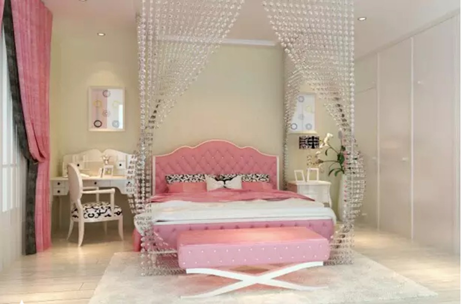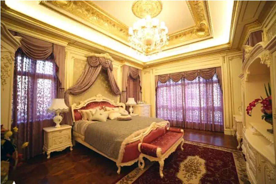 圓頂帳幔和厚重絲絨的搭配,絕對是營造奢華皇室風(fēng)格的最佳拍檔,但把溫柔別致的薔薇粉色運(yùn)用在這里恐怕并不多見,呈現(xiàn)的效果卻是出人意料地精彩:讓奢華少了一點浮夸,又增加了些許寧靜質(zhì)感。絲絨帳幔的內(nèi)層很細(xì)心地采用了更加淺淡的適合睡眠的豆沙粉色,讓被封閉住的空間只留下寧靜舒適。寢具的選擇延續(xù)并弱化了帳幔的粉色,漸次淺淡的粉色鋪滿一床,溫柔得讓人想立即沉睡其間。