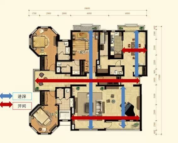 開(kāi)間、進(jìn)深:習(xí)慣上,我們把房間的主采光面稱為開(kāi)間(面寬),與其垂直的稱為進(jìn)深。也可根據(jù)房間門(mén)的朝向來(lái)確定開(kāi)間和進(jìn)深,房門(mén)進(jìn)入的方向的距離為進(jìn)深,左右兩邊距離為開(kāi)間。