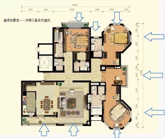 通透性主要是指戶型的通風(fēng)和采光性能。要保證戶型具有良好的通透性能,首先要求戶型要有良好的進(jìn)深開(kāi)間比,即戶型比較方正;其次戶型最好有兩面可以采光和通風(fēng),相對(duì)兩面采光通風(fēng)最佳(如南北、東西)。