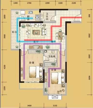 動(dòng)線良好(從入戶門(mén)進(jìn)客廳、臥室、廚房的三條條線不會(huì)交叉)范例如下: