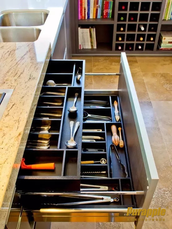 由于廚房的用品多而雜,然而小廚房的面積又小,物品的擺放有可能顯得雜亂無(wú)章,那么在設(shè)計(jì)的時(shí)候就要考慮到小廚房應(yīng)該盡量的將收納功能做到優(yōu)。