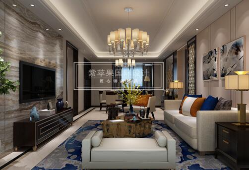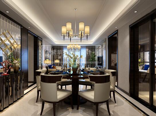 沙發(fā)背景墻上的金屬序列顯得富有哲學感和空間藝術的味道,簡單的電視背景墻沒有做太多的裝飾,電視背景墻整面貼石材和木的完美細節(jié)收口顯的極為精致。一進客廳就能感受到空間的層次感,令空間視覺擴大了很多。客廳地面也是采用的飄逸的紋理石材。沙發(fā)圍繞著茶幾,沙發(fā)獨立成組靠在一角,吊燈更是新穎浪漫,給人一種舒適安靜的感覺。