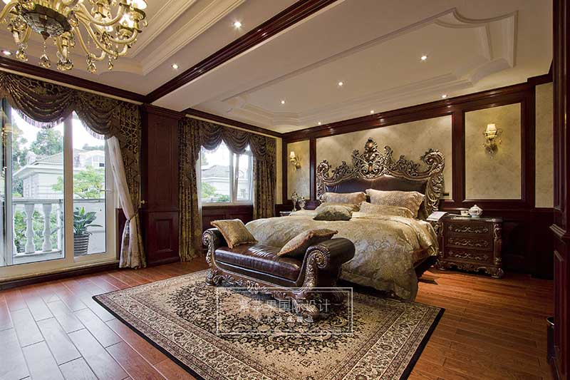 臥室空間以暖色調(diào)為主,呈對稱性的床頭裝飾面板設(shè)計,淡黃色壁紙,華美燈飾,恢弘大氣,雕琢精致的家具,舒適的床品,面積寬大的華麗地毯,種種細(xì)節(jié),勾勒出尊貴典雅,溫馨享受的臥室空間。