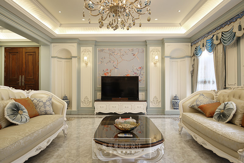 開(kāi)放式的空間結(jié)構(gòu)、隨處可見(jiàn)的花卉和綠色植物、雕刻精細(xì)的家具……所有的一切從整體上營(yíng)造出一種田園之氣。Tiffany藍(lán)的純粹,靈動(dòng),浪漫又優(yōu)雅,讓很多為之癡狂,設(shè)計(jì)師將它融入在空間里,在白色墻面,白色家具的襯托下,顯得空間清澈純凈,如絲般流動(dòng)柔滑,一股浪漫的氣息在空間里肆意流轉(zhuǎn)!