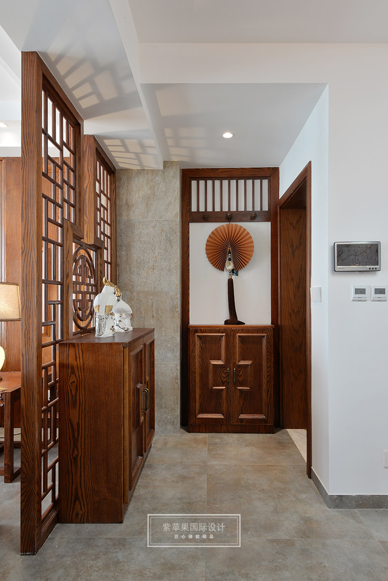 一入門,設(shè)計師用中式木格花簡單隔斷,將玄關(guān)勾勒出來,又利用木格花的通透不隔斷客廳與玄關(guān)的聯(lián)系,形成了一個相對通透的空間,再簡單擺放一個純正中式風(fēng)格的玄關(guān)柜和鞋柜滿足日常生活需求,就將玄關(guān)完整表現(xiàn)出來,簡單獨特有趣味。