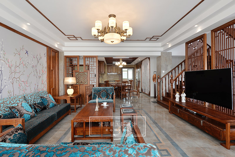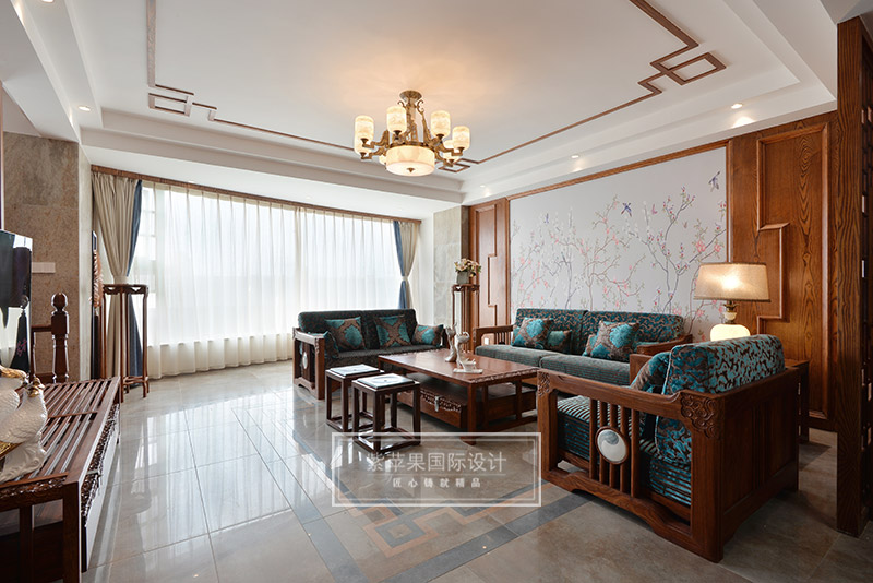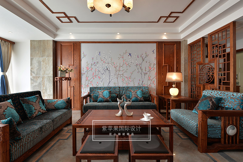客廳的回紋吊頂和中式吊燈,搭配傳統(tǒng)韻味中式家具,形成了一個古雅清新極富傳統(tǒng)魅力的客廳空間??蛷d家具實木色澤,細致做工,花紋精美,散發(fā)著古色古香的韻味,與背景墻上灰色花鳥主題的花紋相互映襯,感受清雅精致,溫馨愜意。