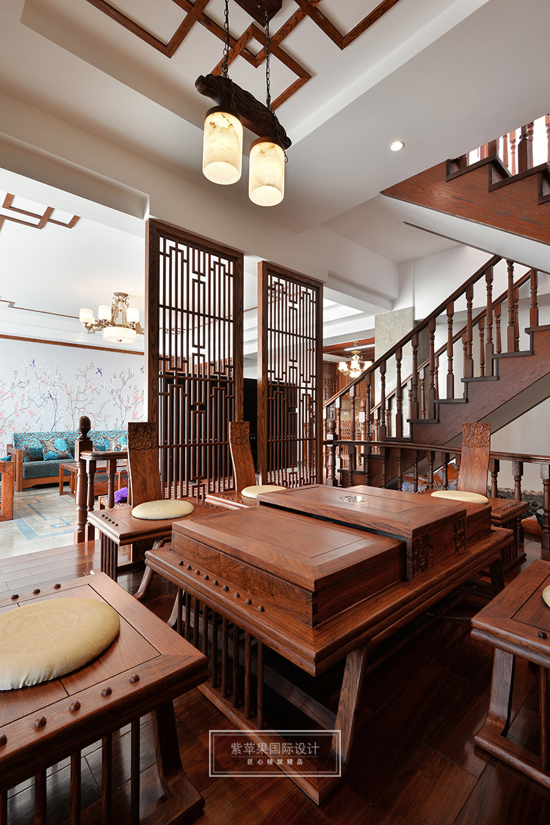 茶室與客廳也是運用木格花進行簡單隔斷,運用地面材料的變化進行空間劃分。茶室空間延續(xù)客廳實木色調(diào),因為品茶本身的器具會非常多,茶室的裝飾方面則變得簡潔起來,選用的家具都是線條比較流暢、造型簡單的中式家具,雖簡單卻不失韻味。茶室旁邊還有個室內(nèi)假山的景致,與家人或是親朋品茗聊天之時,又可聽到潺潺水聲,更有一番世外桃源的感受。茶室墻面保留了原有的銹石磚紋路,保留了老房子氣息,復(fù)古又有韻味。特別放置的吊燈和宮燈,也作為點睛之筆,為整體空間增添古色古香的傳統(tǒng)氣氛。