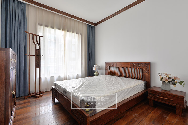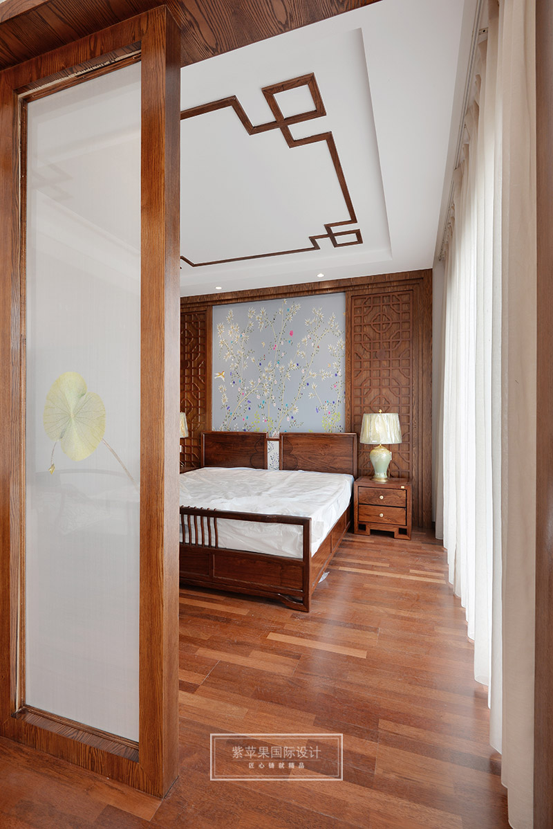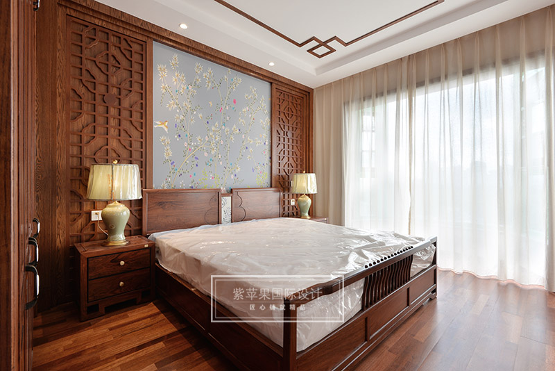 主臥與客餐廳風(fēng)格一致,在灰色花鳥主題背景和回紋吊頂?shù)挠骋r下,中式韻味在臥室空間里也獲得盡情展現(xiàn)。