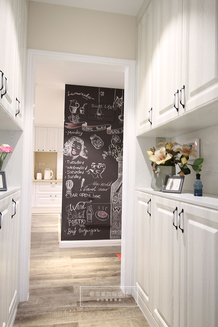 設(shè)計(jì)師將門廳旁的過道空間加以改造,設(shè)計(jì)成兼顧換鞋及更衣的更大儲(chǔ)物空間。入戶整面黑板墻讓女主人能夠盡情揮灑回憶與無限的想像力。