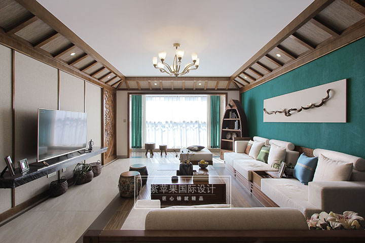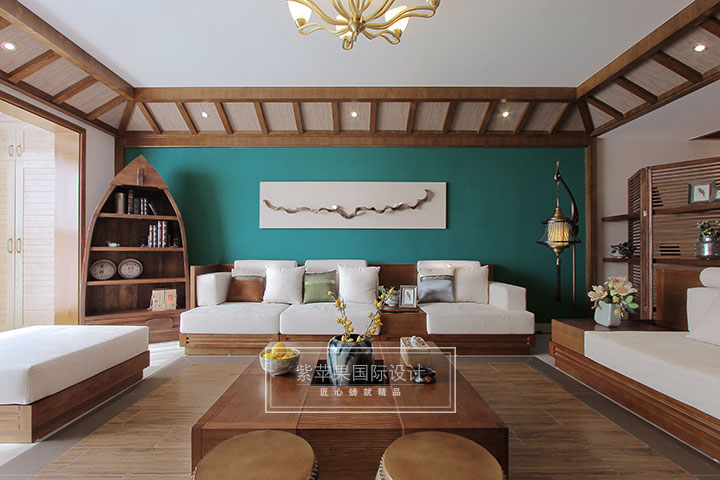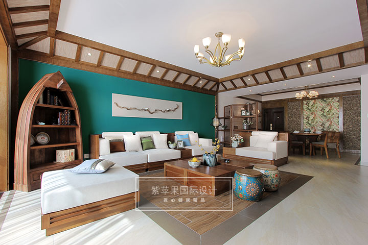客廳東南亞獨(dú)具特色的木質(zhì)斜屋吊頂,與整體空間協(xié)調(diào)一致,搭配同一色系的茶幾、沙發(fā)形成了一個(gè)休閑優(yōu)雅的客廳空間。沙發(fā)旁船型柜格外引人注目,其造型獨(dú)特別致但不失實(shí)用功能,與家具同一色系并不顯突兀,而是巧妙融合。