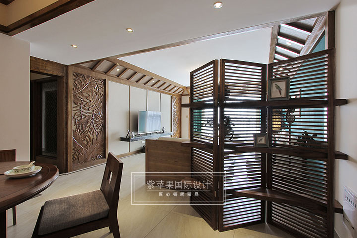 客廳與玄關(guān)用造型獨(dú)特的木質(zhì)格柵做了簡單隔斷,分隔出兩個(gè)不同功用的空間。