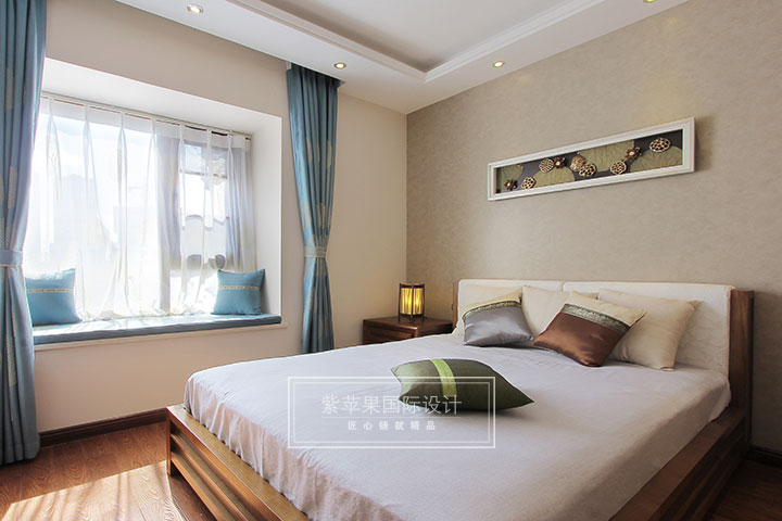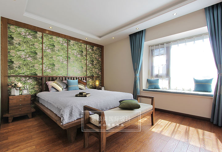 主臥延續(xù)客廳棕色調(diào),但用藍(lán)色、綠色加以點(diǎn)綴,感受有所不同。主臥室選用深木色的格柵和綠色花紋壁紙做床頭背景,布藝窗簾和抱枕的藍(lán)色結(jié)合光線的變化,創(chuàng)造出讓人回歸自然的感覺,使其空間眼前豁然一亮。
