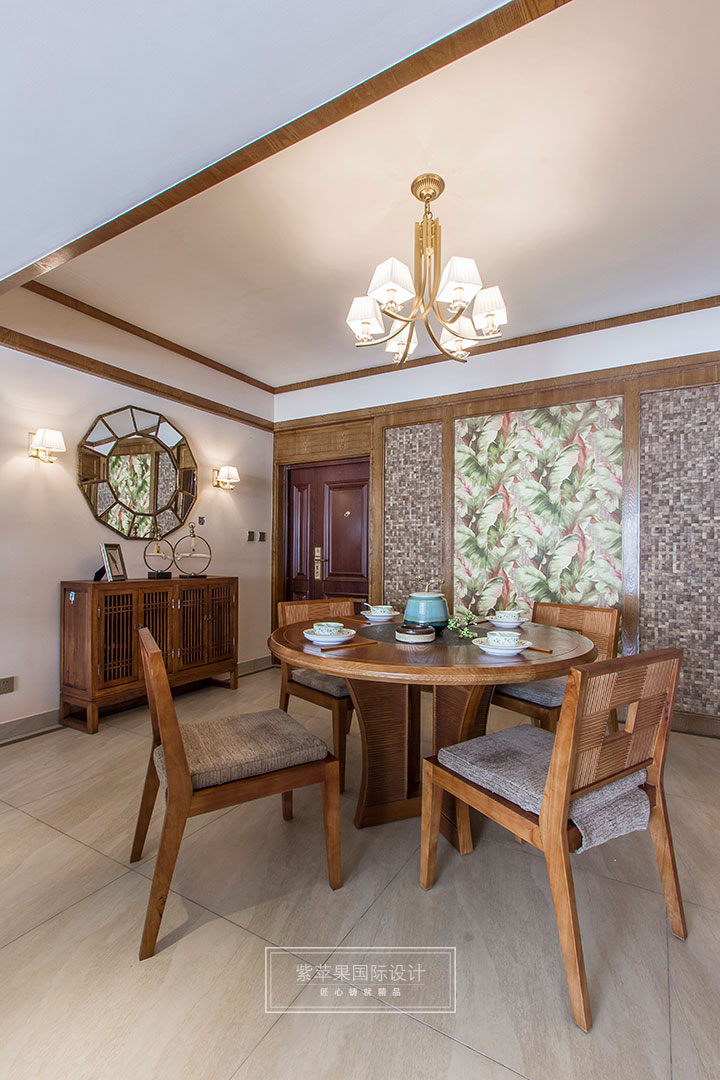 餐廳空間,設(shè)計(jì)師巧用椰殼馬賽克制成木質(zhì)背景墻,讓業(yè)主用餐的時(shí)候便感覺到大自然的生態(tài)和天然。餐廳頂面做了簡單的木質(zhì)線條,讓整體空間簡單又不失自然。